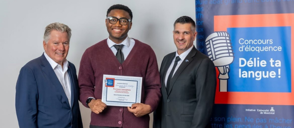 Michel Robitaille, président du Conseil d'administration, Centre de la francophonie des Amériques, Steve Kawe, étudiant gagnant et  Sylvain Lavoie, président-directeur général, Centre de la francophonie des Amériques.